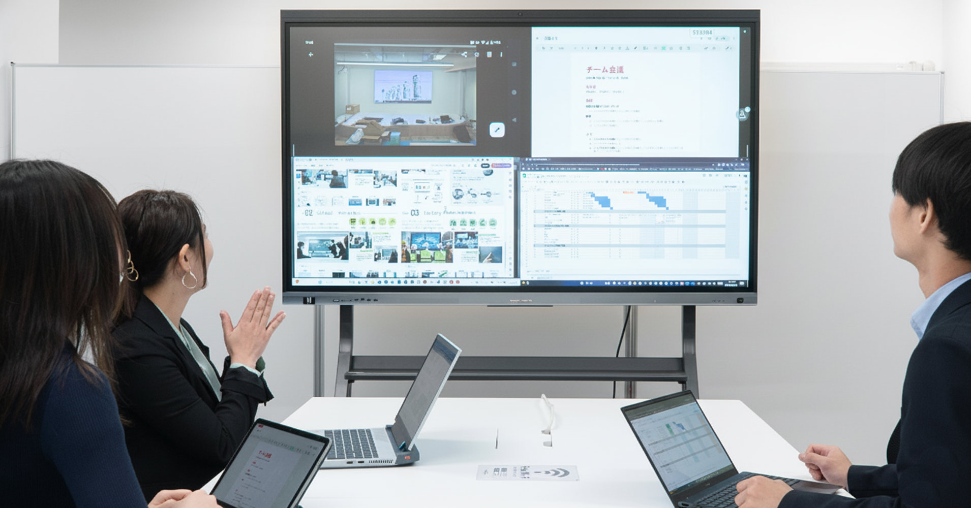 STUDIAにはデジタルサイネージ、ホワイトボード、スクリーン、プロジェクター、ウェブカメラ、マイク、コード類の全ての機能が集約されています。Web会議やミーティングを実施する時には、他には何も要りません。